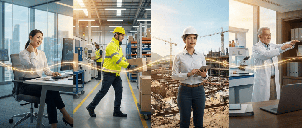 Identifying the "Work-Load" Impact: Mapping how specific tasks, whether on a construction site, in a lab, or at a desk, create localised neural and muscle fatigue.